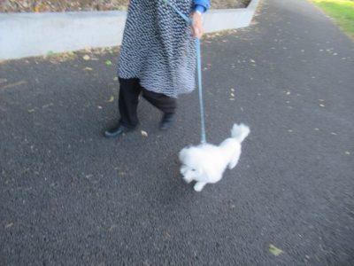 それでも練習のアドバイスの基本の「普段はリードをたるませて歩く」「真横からずれた時にリードを引いたり、Uターンして意識を向ける」「合わせて歩いている時に褒める」事を中心にしっかり練習して頂きつつ、車や自転車が来て興奮しそうな時はお座りさせて落ち着かせるなどの対処をしていくと、お母さんが練習中も徐々に落ち着きが出てきて、合わせる事ができてきました♪
