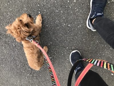 踏ん張る事がなくなり、左右にずれる事も減ってきました!前に出たり遅れた時はリードを引いて合わせて歩くように促しながら練習し、Uターンしたり歩くペースを変えて変化をつけた練習も繰り返し行い、集中が持続するようにしていきました!