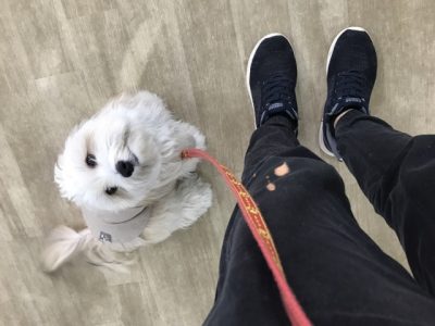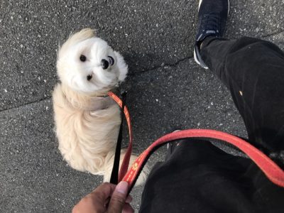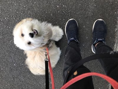 「つけ」は、真横からずれた時はリードを引いて合わせて歩くように促し、良くなってくるまで練習していきました!