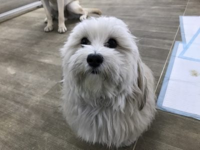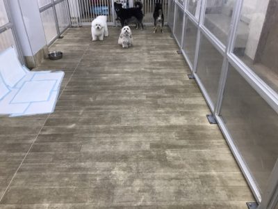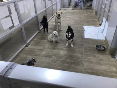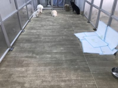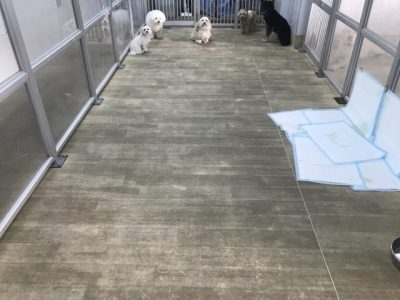来店時はサークル内のワンちゃんを見て吠えていましたが、お預かりした瞬間から静かになり、サークルに入っても、大きなワンちゃんが側に来てもへっちゃらで、吠える事はなかったので褒めました♪