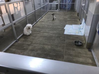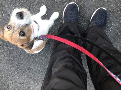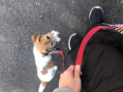 外だと室内に比べて止まる事が多くなるので、リードを引いたり屈んで声をかけて自分から歩くように促しながら、良くなってくるまで練習していきました!