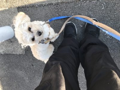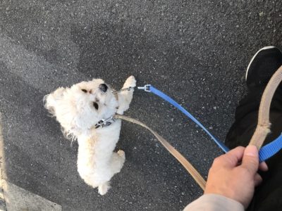 「ついて」は、踏ん張った時は屈んで声をかけて自分から歩くように促しつつ、歩き始めたら声をかけて褒め、一緒に歩く楽しさを教えていきます♪歩き始めた後は、真横からずれたり飛びついた時にリードを引いて合わせて歩くように促し、良くなってくるまで練習していきました!
