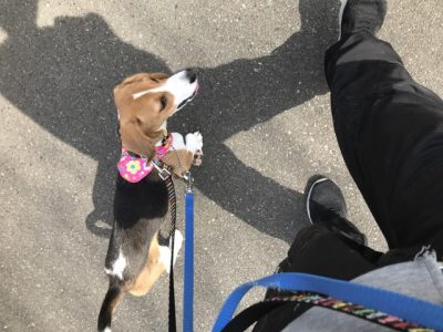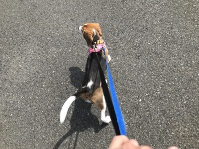 お散歩は、グイグイ前に出たり横にずれたりするので、リードを引いたりUターンして意識をこちらに向けるようにしながら練習♪